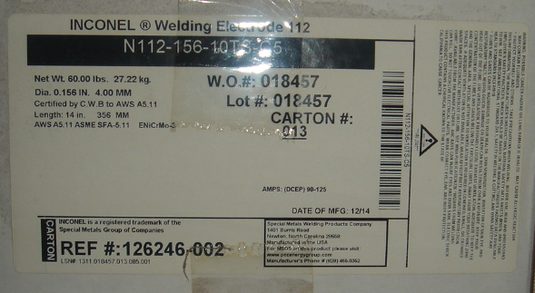 AWS A5.14,ERNiCrMo-3 Werkstoff Nr.2.4831 ASME Ⅱ,SFA-5.14,ERNiCrMo-3 DIN 1736 EL-NiCr20Mo9Nb 規格 ASME Ⅸ,F-No.43 AMS 5837 UNS N06625 ISO SNi6625 MIL-E-21562 Types MIL-RN625,MIL-EN625 Europe NiCr22Mo9Nb | |